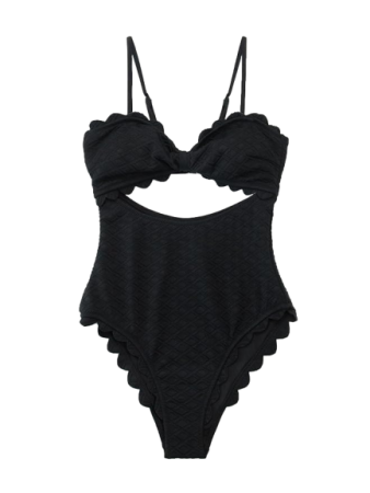 From the scalloped trim detail to the flirty below-the-bustline cutout, this sexy black suit truly has it all.