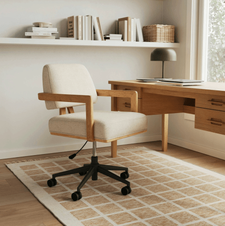 If you’re looking for a sophisticated chair that’s a little easier on the wallet, the Aquila Office Chair pairs a solid oak frame and adjustable seat with soft bouclé upholstery and foam padding to keep you comfortable and supported throughout the day. It features smooth caster wheels and height-adjustable positioning.
