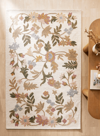 The Floral Lyricism artisanal rug showcases delicate Art Nouveau–inspired blooms on an ivory backdrop, bringing poetic elegance and softness to any room. Handmade in India with a cotton back and high-quality tufted wool.