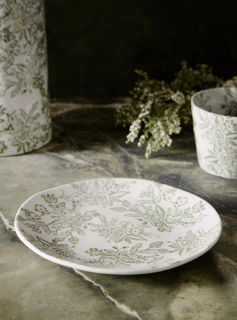 This floral tapestry plate features a charming botanical motif on glossy ceramic, bringing a vintage-inspired aesthetic to everyday dining while remaining practical with its dishwasher- and microwave-safe design.
