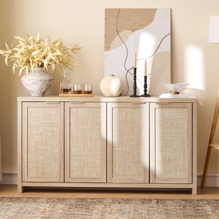 For a light and airy spring feel that gives you ample storage space – this elegant rattan paneling with a warm light oak finish complements your dining room, living area, or entryway. It features adjustable shelves and sturdy manufactured wood construction for maximum practically.