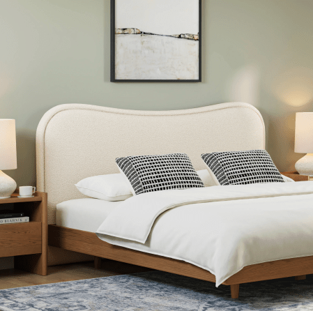 The Makoa King Headboard in Ivory Wool Bouclé embodies the Spring 2026 emphasis on tactile texture and soft Scandinavian design, combining durable, stain-resistant bouclé with gentle curves and channel detailing to create a refined yet inviting bedroom focal point.