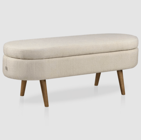 This Bouclair Taupe Fabric Storage Bench features a cushioned taupe fabric seat with a hidden storage compartment, supported by sturdy rubber wood legs for a stylish and practical addition to any entryway or bedroom.