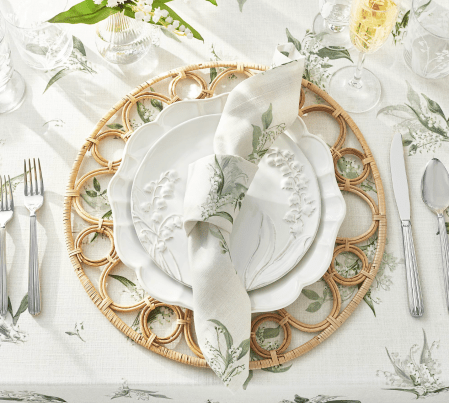 This handwoven rattan charger plate from Pottery Barn showcases artisanal craftsmanship, adding organic texture and warmth to any tablescape. Measuring 15 inches in diameter, this lightweight yet durable piece creates an elegant foundation for layered place settings, making it perfect for spring brunches or relaxed afternoon lunches.