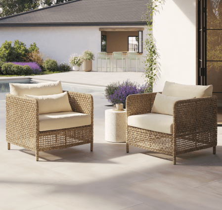 Featuring synthetic wicker and luxuriously cushioned seating, this outdoor lounge chair set from Article features durable all-weather construction for worry-free outdoor lounging.